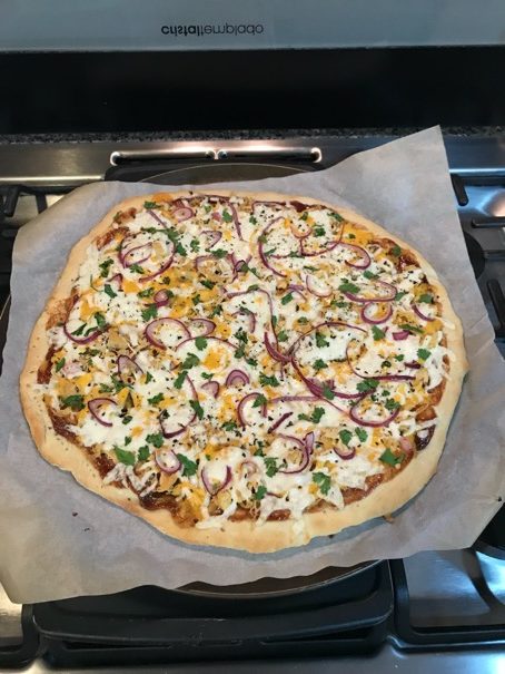 Heat your oven to 450-500 degrees Fahrenheit. On a large pizza pan or cookie sheet place a piece of parchment paper for easy cleanup (aluminum foil works too but if you don’t add cornmeal then you may need to spray the foil with cooking spray so that the pizza doesn’t stick). Sprinkle the parchment paper with cornmeal if you have it and if you like a little crunch on the bottom of your crust. Use one pizza dough prepared from recipe found on this site or your favorite store bought dough. My pizza dough can be split into three pizzas. I usually make two and freeze the other in a zippered freezer bag. Stretch your pizza dough out pretty thin (1/4 – 1/2 inch or about 14 inches round). Place the dough on the parchment paper and then use a fork to poke holes all over it to keep air from puffing the dough up. Place the plain dough into the oven and bake for 5-7 minutes. Remove the pizza from the oven and spread a thin layer of your favorite bbq sauce all over it leaving a 1/2 inch edge for the crust. Top with shredded chicken, cilantro pieces (optional) or dried cilantro (optional), shredded colby jack cheese or a pizza blend cheese, and then sliced purple onions. Return the pizza to the oven and bake for about 10-12 more minutes or until the crust is lightly golden brown and everything is warmed through and the cheese is melted. Warning don’t over top your pizza or your dough will have a hard time cooking completely and will taste gummy and your toppings will slide off. When the pizza is fresh from the oven sprinkle with more fresh chopped parsley if you would like to garnish the pizza.