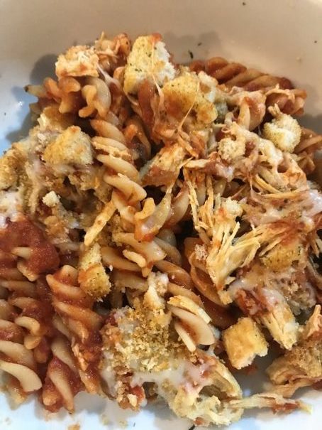 Preheat your oven to 350 degrees Fahrenheit. Spray a 9×13 glass casserole dish with cooking spray. Chop or shred 2 cooked chicken breasts. Boil 3/4 of a box of spiral noodles until they are al dente. They will cook longer in the oven so don’t overcook them. Drain the noodles and mix 1/2 jar of pasta sauce with the noodles and the chicken. Pour this mixture into the casserole dish and add a layer of sauce to the top and then a layer of mozzarella and Parmesan cheese. Finally, top the casserole with a layer of croutons (Italian, Caesar, Ranch, whatever flavor you like). I used smaller croutons but I would crush them up a little so that they’re not too big for a bite if they’re the larger sized croutons. Cover the dish with aluminum foil and bake for 25 minutes. Uncover it and bake for 5 more minutes. This served our family of four.
