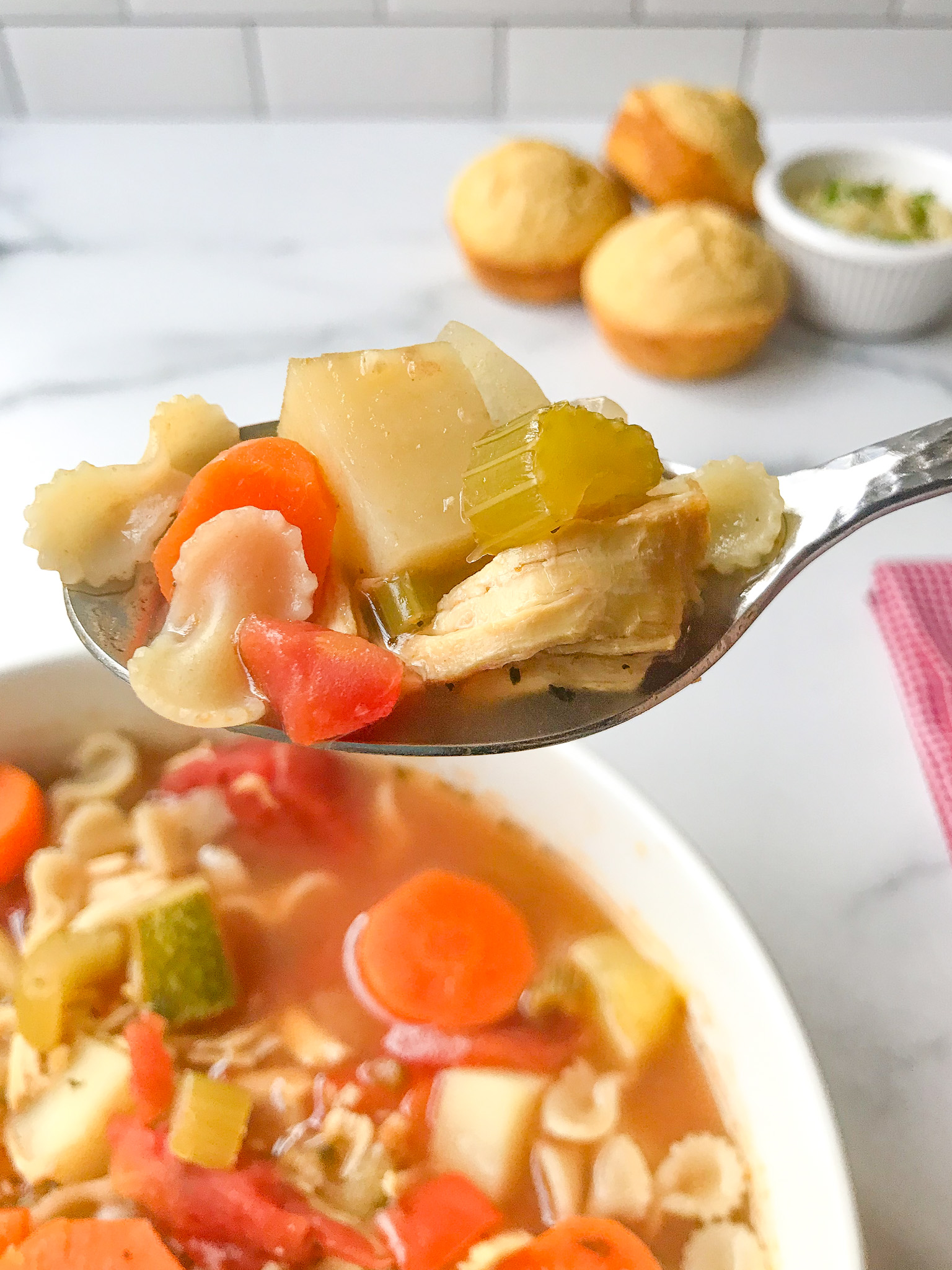 Note – If you don’t feel like measuring the chicken and vegetables then use 2 – 3 chicken breasts, 1/2 of a large onion, 3 medium carrots, 3 stalks of celery, 2 medium potatoes, 1 large red bell pepper, and 1 medium zucchini. The garlic will be about 3 medium cloves before minced.